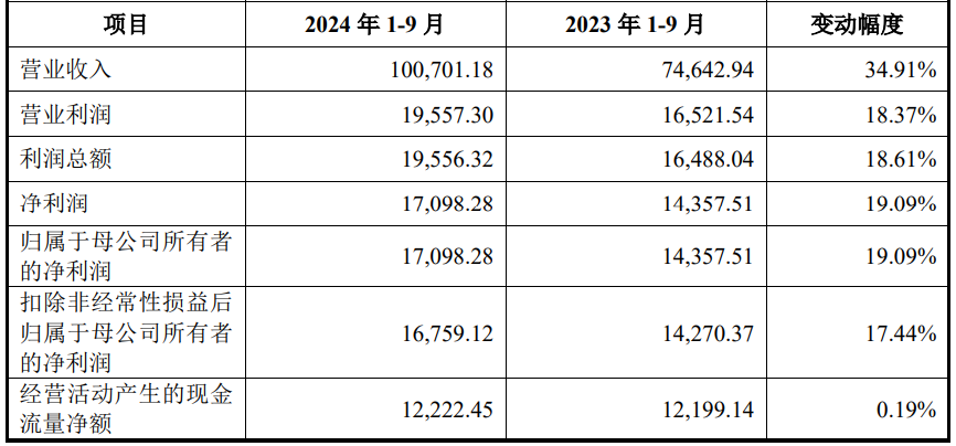 2024年1-9月,博苑股份实现营业收入100,701.18万元,变动幅度34.91%;净利润/归属于母公司所有者的净利润为17,098.28万元,变动幅度19.09%;扣除非经常性损益后归属于母公司所有者的净利润为16,759.12万元,变动幅度17.44%;经营活动产生的现金流量净额为12,222.45万元,变动幅度0.19%。