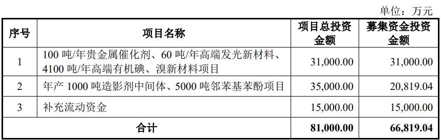 博苑股份本次发行募集资金总额为71,343.20万元,扣除发行费用后的募集资金净额为62,816.77万元,公司最终募集资金净额比原计划少4,002.27万元。博苑股份2024年12月5日披露的招股书显示,公司拟募集资金66,819.04万元,用于“100吨/年贵金属催化剂、60吨/年高端发光新材料、4100吨/年高端有机碘、溴新材料项目”“年产1000吨造影剂中间体、5000吨邻苯基苯酚项目”“补充流动资金”。