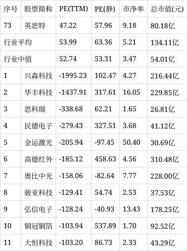从行业市盈率排名来看,公司所处的电子元件行业市盈率平均53.99倍,行业中值52.74倍,英思特排名第73位。