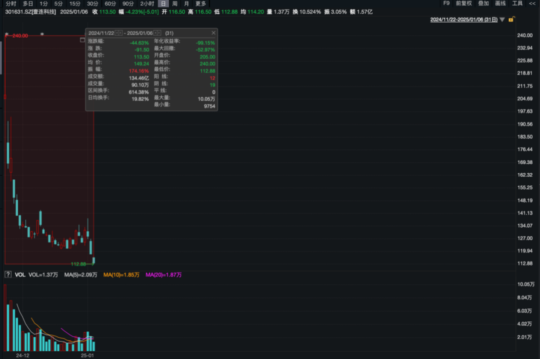 数据显示,截至2025年1月6日收盘,壹连科技股价已经较上市首日的跌幅达-44.63%,期间累计离场资金为134.46亿元,而这仅仅只经历了31个交易日。