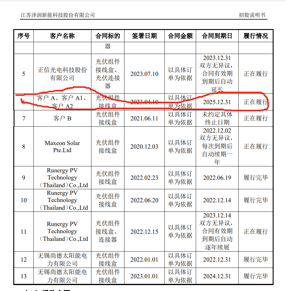 据招股书,尽管报告期内公司来源于客户A收入占比不超过50%,但由于客户A接线盒毛利率较高,公司在2022年度及2024年度存在来源于客户A的毛利贡献占比超过50%的情形,根据《监管规则适用指引——发行类第5号》的规定,公司存在对客户A单一客户重大依赖的情形。公司与客户A的合同于2023年4月签订,合同到期日为2025年底,一旦合同到期不能续签,公司业绩持续性将面临重大考验。