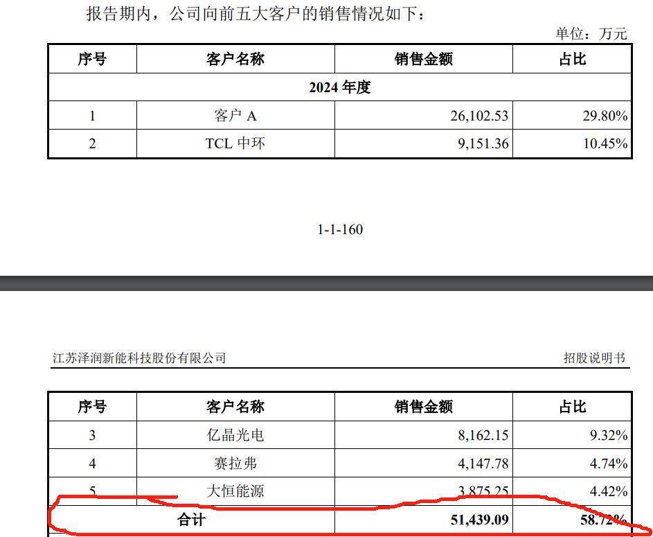 此外,泽润新能的2024年应收款多来自前五大客户之外,这同样值得警惕。报告期,公司对前五大客户的销售额分别为3.84亿元、6.18亿元和5.15亿元,占比分别为73.54%、73.23%和58.72%,其客户集中度较高。