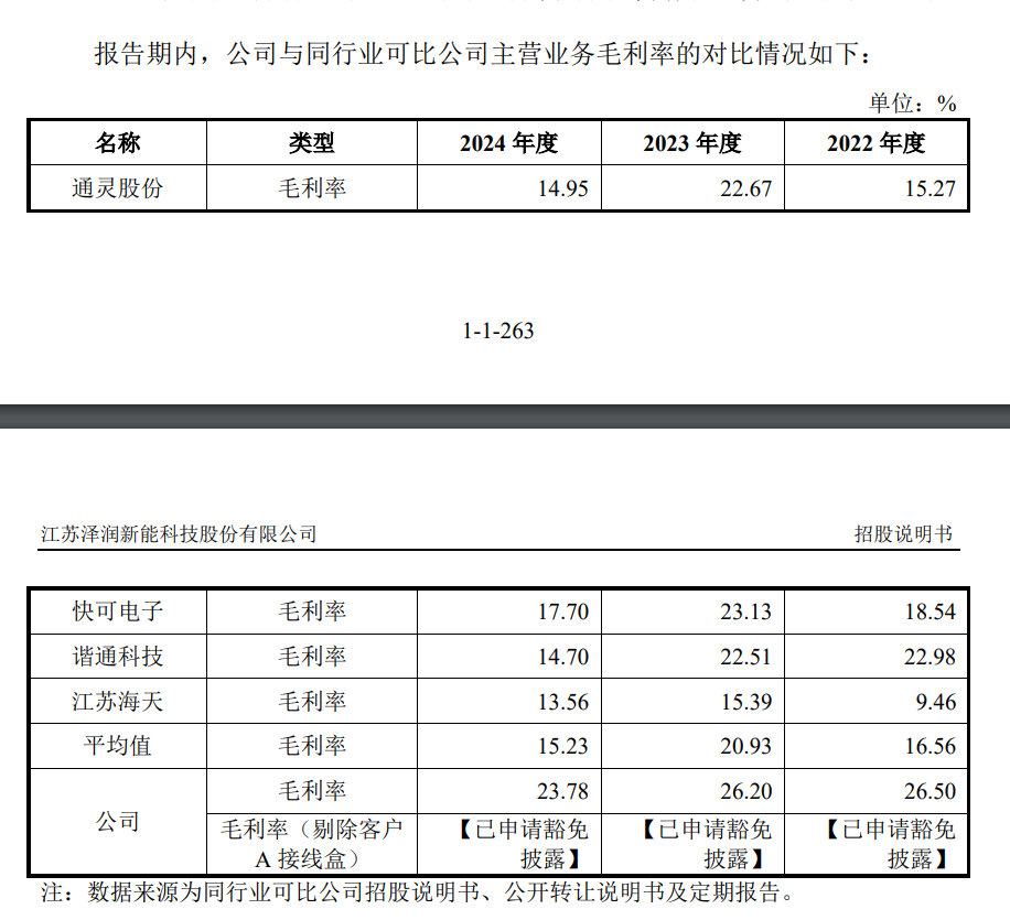 据招股书,泽润新能把通灵股份(301168)、快可电子(301278)、谐通科技(874274)、江苏海天(835435)四家公司列为可比对象,上述四家均以光伏连接盒为主业,其中通灵股份2024年以8079万套为行业龙头。