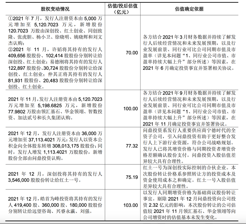 值得关注的是,在2021年下半年首航新能进行的多次增发与股权转让中,公司估值存在较大变化。2021年7月进行的增发与2021年11月进行的转让,公司估值均为70亿元,2021年11月的增发估值则增长至100亿元。2021年12月宁德时代旗下问鼎投资参与的增发,公司估值又回落至77.32亿元。
