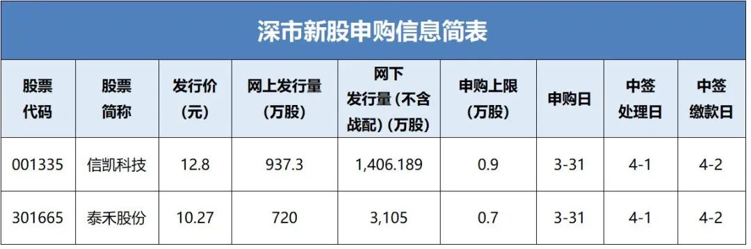 2025年3月31日,浙江信凯科技集团股份有限公司(简称:信凯科技)、南通泰禾化工股份有限公司(简称:泰禾股份)将通过深交所网下发行电子平台和交易系统发行新股,具体信息如下。