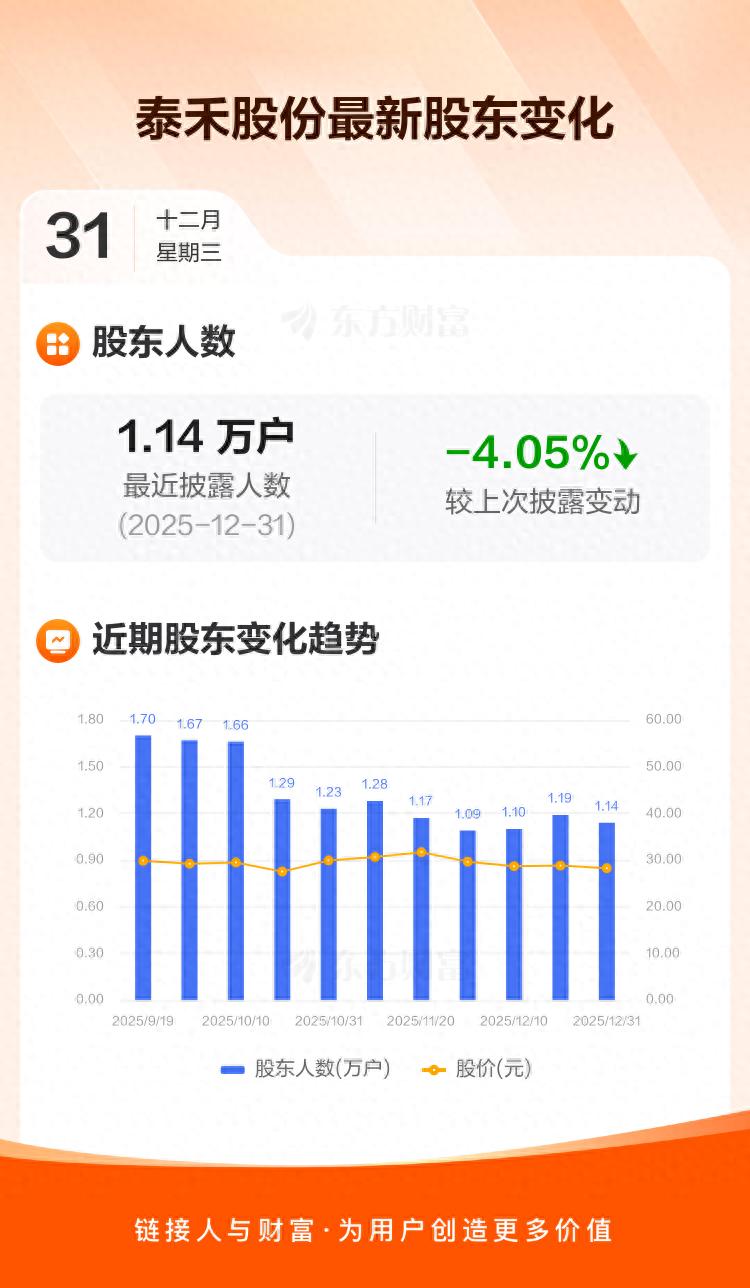 泰禾股份最新披露数据显示,截至12月31日公司股东户数为1.14万户,较上期(2025年12月19日)减少481户,降幅为4.05%。户均持有流通股数量由上期的3217股上升至3353股,户均持股金额由上期的9.27万元增加至9.47万元。