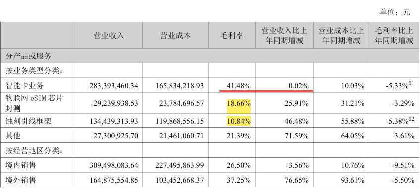 虽然公司蚀刻引线框架与物联网eSIM芯片封测业务的营收占比略有上升,但尚未形成规模,二者的营收占比相加不足35%。且二者的毛利率均同比下降,远低于智能卡业务的毛利水平。尽管三大业务之间此消彼长,但动力不足,使得公司整体盈利能力被稀释,暴露了公司增长结构失衡的问题。