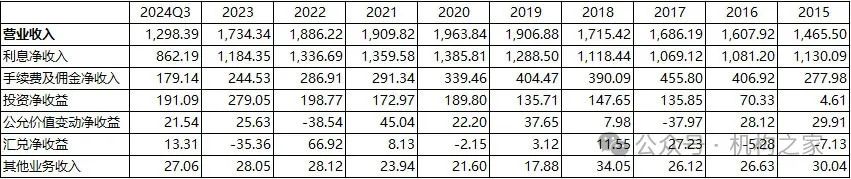 而与之息息相关的手续费及佣金净收入,也在更早的2019年达到峰值404.47亿元,之后连年下滑,2023年仅为244.53亿元、同比下滑了14.77%。