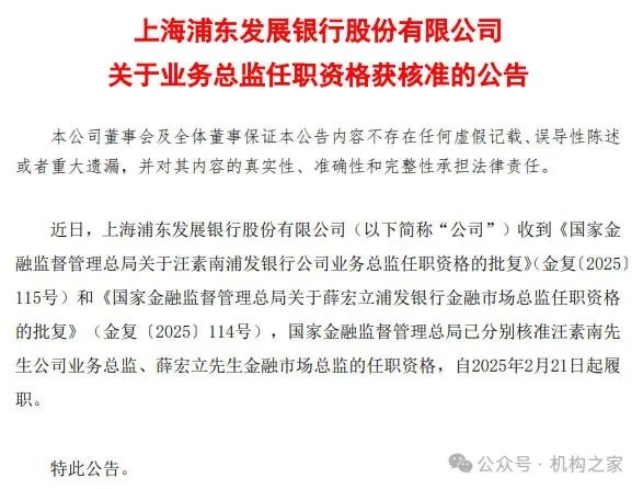 概言之,该行已“收到《国家金融监督管理总局关于汪素南浦发银行公司业务总监任职资格的批复》(金复〔2025〕115号)和《国家金融监督管理总局关于薛宏立浦发银行金融市场总监任职资格的批复》(金复〔2025〕114号),国家金融监督管理总局已分别核准汪素南公司业务总监、薛宏立金融市场总监的任职资格,自2025年2月21日起履职。”