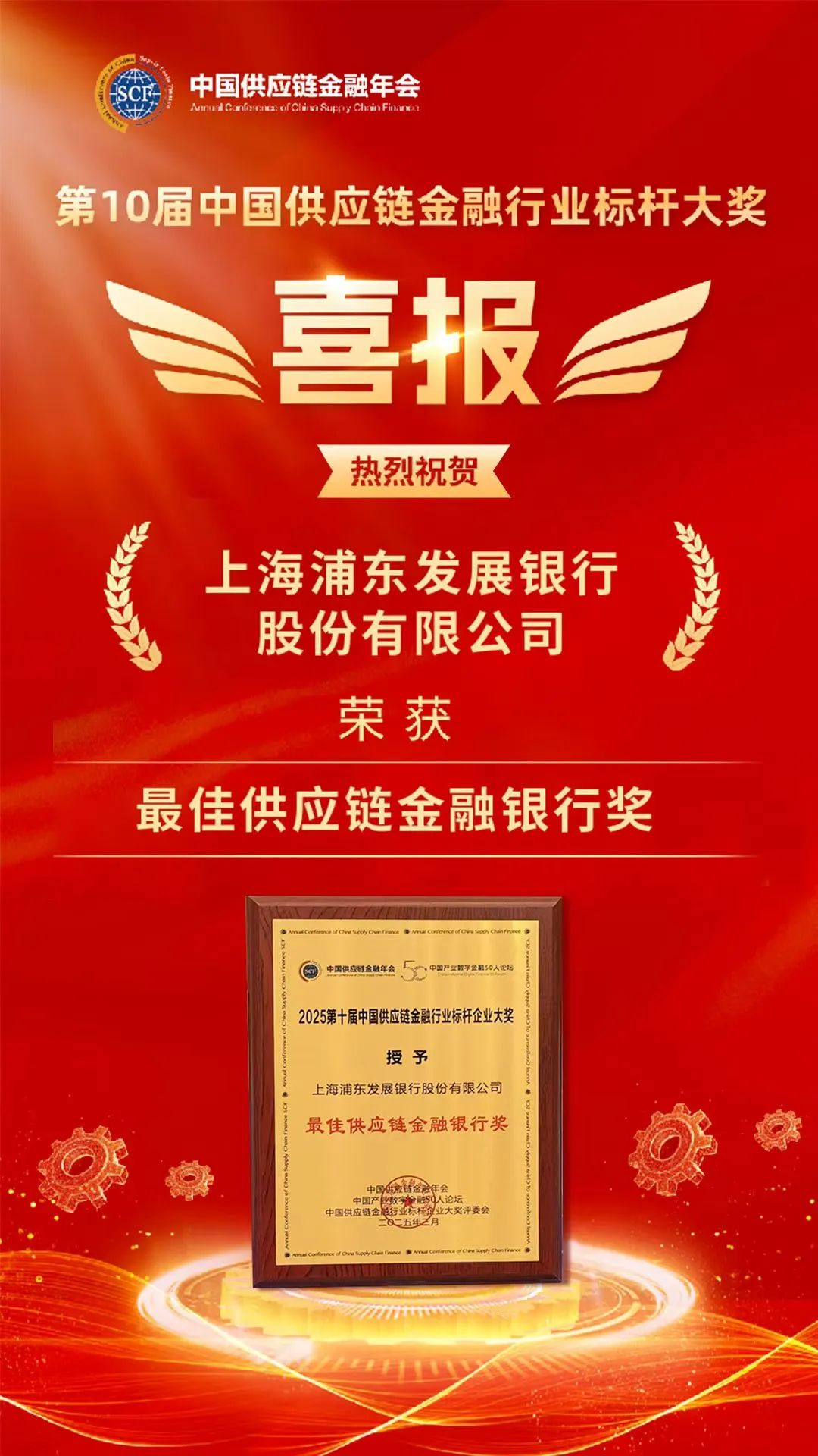 近日,第十届中国供应链金融年会暨第十届“中国供应链金融行业标杆大奖”颁奖典礼在北京举行。浦发银行荣获“最佳供应链金融银行”奖项。