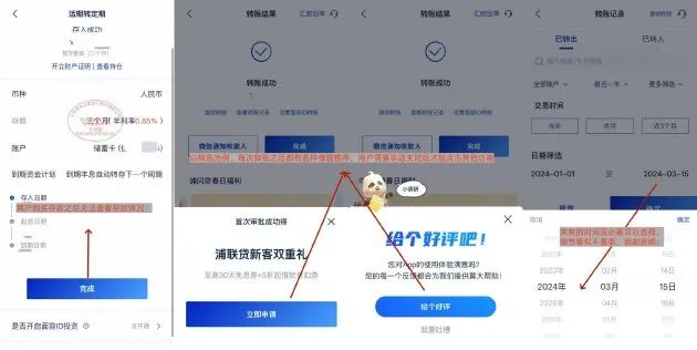 交互体验方面,浦发银行App“首页”可以找到账户、转账等常用操作,且常用操作之间进行了适当交互。常用旅程中,用户购买定期存款之后仅设置了“完成”(返回“定期存款”页面),无法查询“持仓”。
