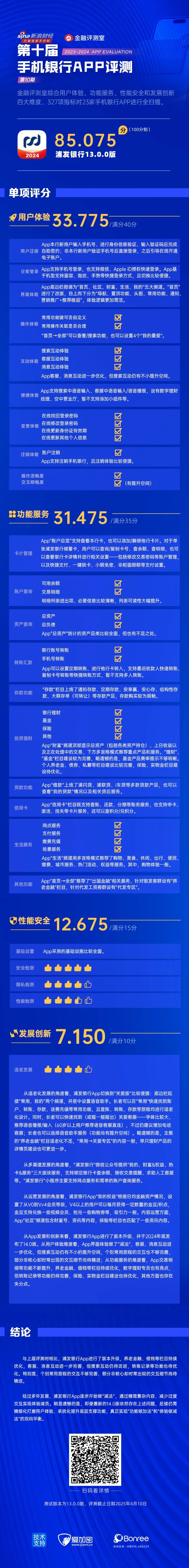 新浪金融评测室综合用户体验、功能服务、性能安全、发展创新4大维度,327项细分指标对浦发银行手机银行App“浦发银行”进行全扫描,最终给予85.075分(总分100)。