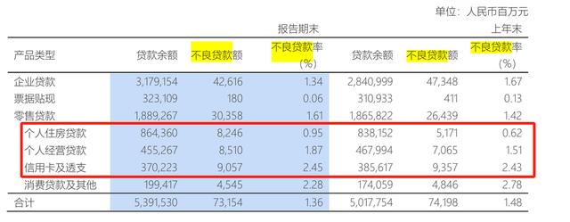 个人贷款中,除了消费贷款及其他不良率下降外,个人住房贷款、个人经营贷款、信用卡及透支不良率都不同幅度上升。信用卡透支不良率达2.45%。
