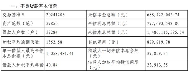 第一份公告内容显示,2025年第一期个人不良贷款未偿还的本息合计为12.58亿元,加权平均逾期天数为1524.49天,计算下来逾期已经超过4年。