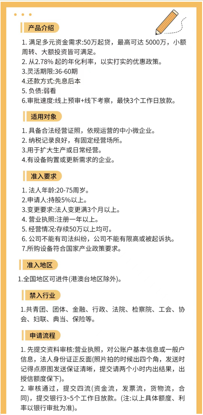 7、担保方式:纯信用贷款,无需抵押/担保,法人零持股企业可申请