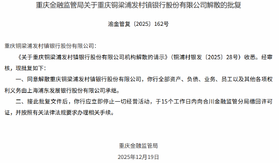 此外,重庆金融监管局同意解散重庆铜梁浦发村镇银行股份有限公司,该行全部资产、负债、业务、员工以及其他各项权利义务由上海浦东发展银行股份有限公司承继。