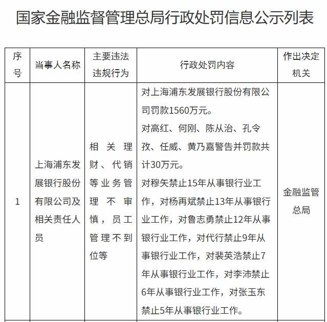 12月19日,国家金融监管总局披露的行政处罚信息显示,上海浦东发展银行股份有限公司收到1560万元罚单,7名责任人受到5~15年不等的禁业处罚。