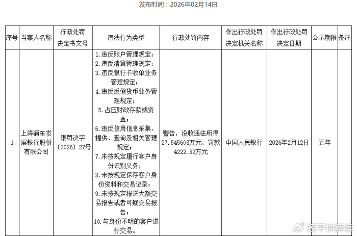 2月12日,浦发银行领巨额罚单,因存在违反账户管理规定;违反清算管理规定;违反银行卡收单业务管理规定;违反反假货币业务管理规定;占压财政存款或资金;违反信用信息采集、提供、查询及相关管理规定;未按规定履行客户身份识别义务;未按规定保存客户身份资料和交易记录;未按规定报送大额交易报告或者可疑交易报告;与身份不明的客户进行交易等违法事实,被中国人民银行警告,没收违法所得27.545608万元,罚款4222.89万元,公示期限为5年。