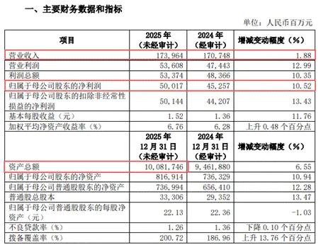 得益于对风险的重视,该行2025年的资产质量指标创下了近十年最好水平。业绩快报显示,其2025年不良贷款余额719.90亿元,同比减少11.64亿元;不良贷款率1.26%,较上年末下降0.10个百分点。