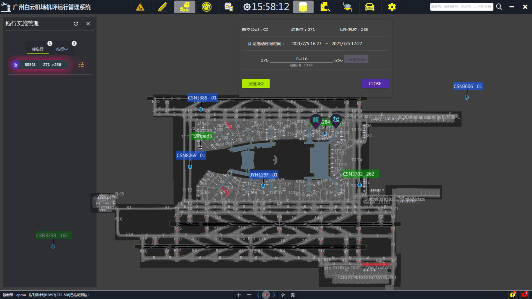 目前,白云机场机坪运行管理系统已完成拖飞机模块和施工实时管控等主要功能模块的开发,实现对飞行区内航空器拖行、施工管理、航班推出排序等工作的全流程实时管控。