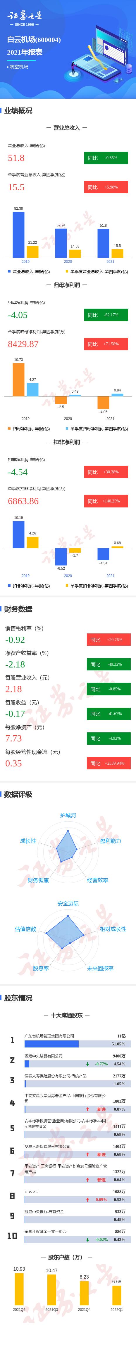 白云机场2021年报显示,公司主营收入51.8亿元,同比下降0.85%;归母净利润-40584.67万元,同比下降62.17%;扣非净利润-45462.54万元,同比上升30.38%;其中2021年第四季度,公司单季度主营收入15.51亿元,同比上升5.98%;单季度归母净利润8429.88万元,同比上升71.58%;单季度扣非净利润6863.87万元,同比上升140.25%;负债率32.47%,投资收益1.17亿元,财务费用9156.35万元,毛利率-0.92%。