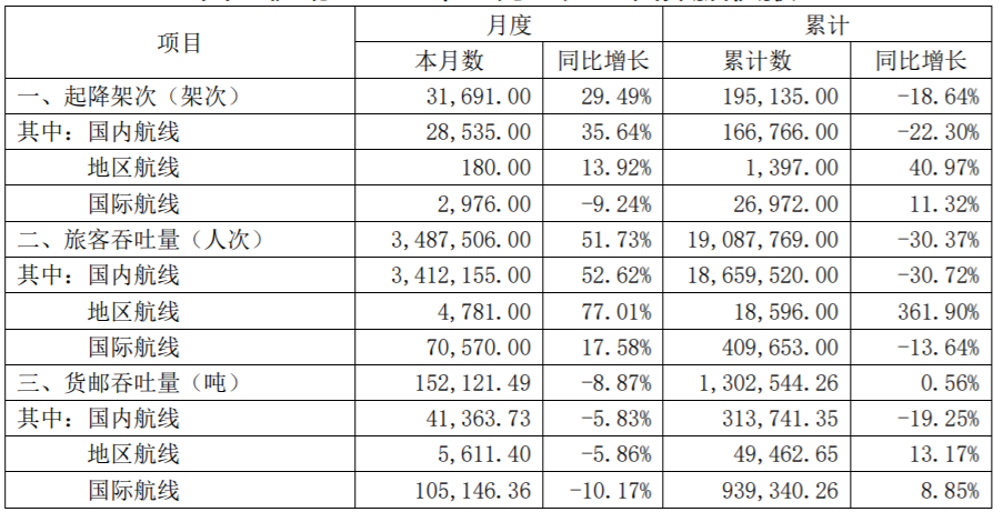8月起降架次31691架次,同比增长29.49%;8月旅客吞吐量348.75万人次,同比增长51.73%;8月货邮吞吐量15.21万吨,同比降低8.87%。