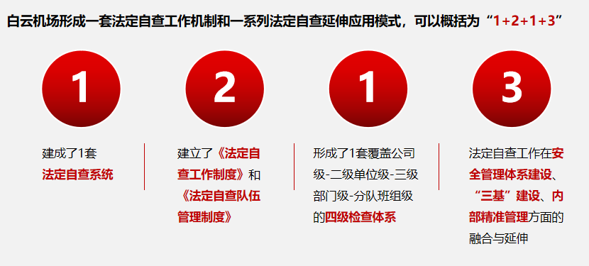 同时,积极推进法定自查工作,制定了法定自查事项清单库(现行版公司级清单包括18个模块、150个检查项目、1196条检查条款),在公司级法定自查清单基础上延伸制定二级单位级-三级部门级-分队班组级检查清单,形成四级检查体系,全面排查治理安全隐患,被民航局政法司确定为法定自查示范单位。