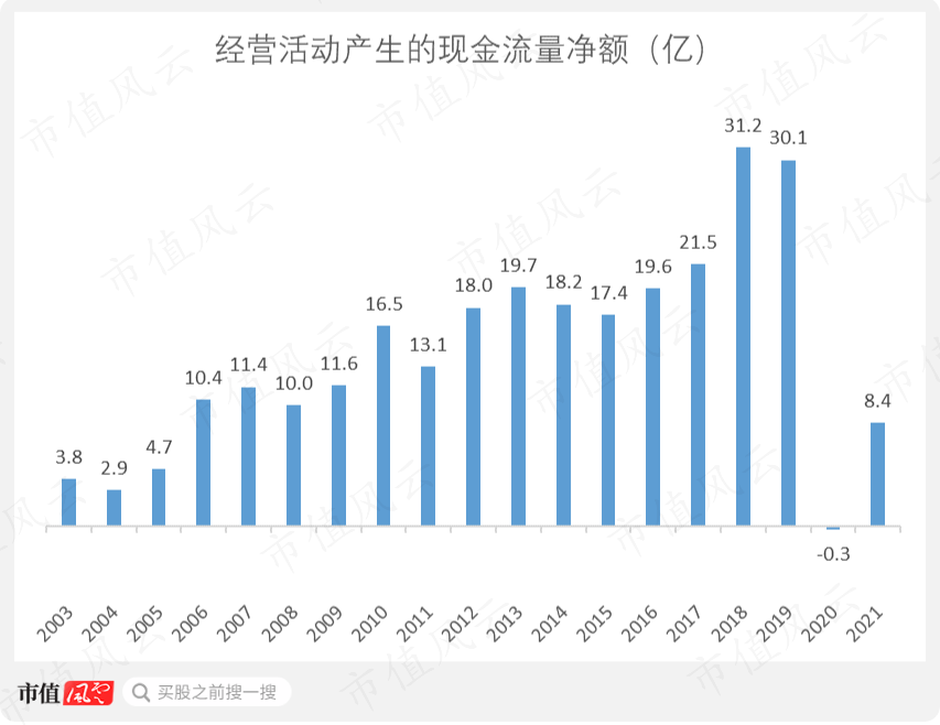 白云机场的经营活动产生的现金流量净额自上市后,在波动中增长。在2018年达到历史最高峰,为31.19亿元。2019年略有下降至30.13亿元。2020年疫情影响,现金流量净额为负0.35亿元,但2021年恢复至8.45亿元。