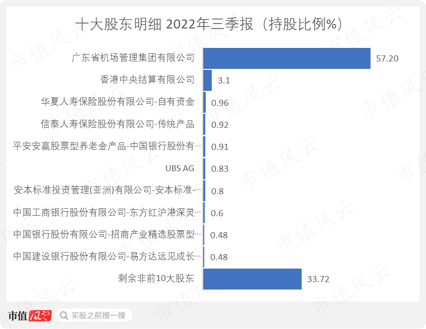 根据2022年第三季度数据,白云机场的第一大股东,广东省机场管理集团有限公司,以57.2%的股份控股。