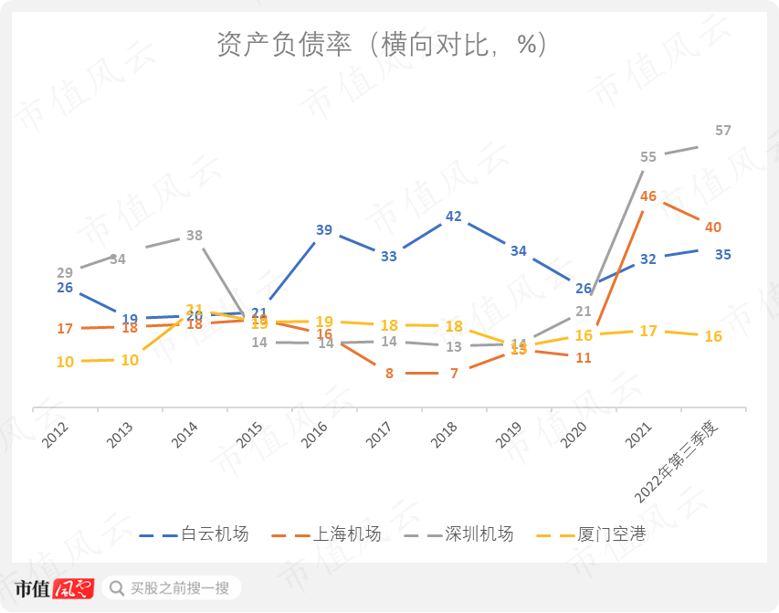 从2012年至2022年第三季度,对比深圳机场(000089.SZ),上海机场(600009.SH),和厦门空港(600897.SH),白云机场的负债水平中等。