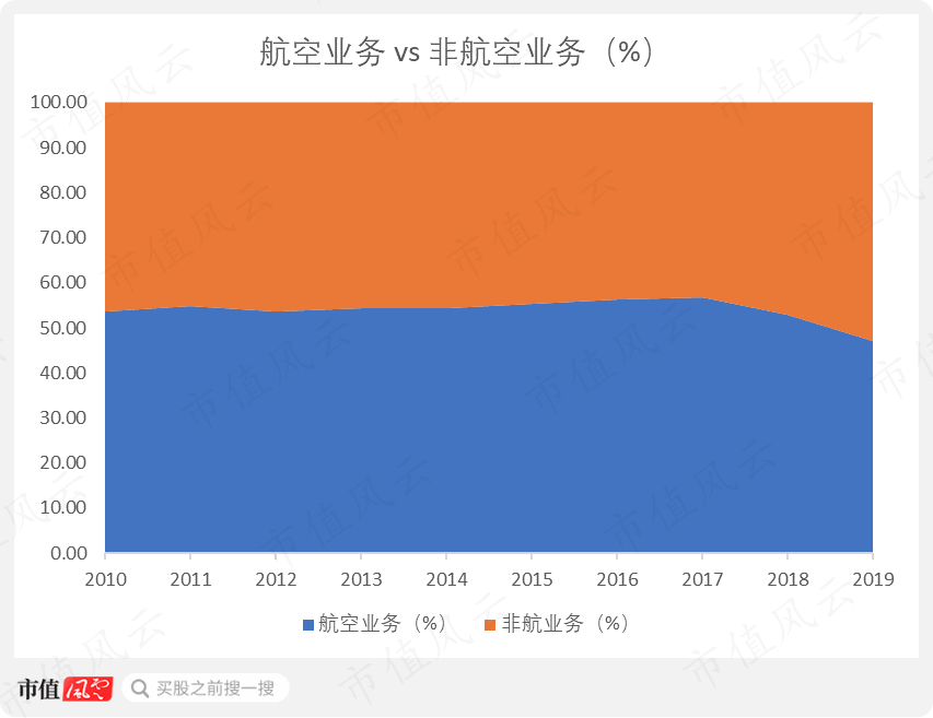 2010-2017年间,航空业务占比略高于非航业务,波动范围较小。然而,2018年开始,非航业务占比逐渐上升,至2019年达52.86%,超过航空业务占比。