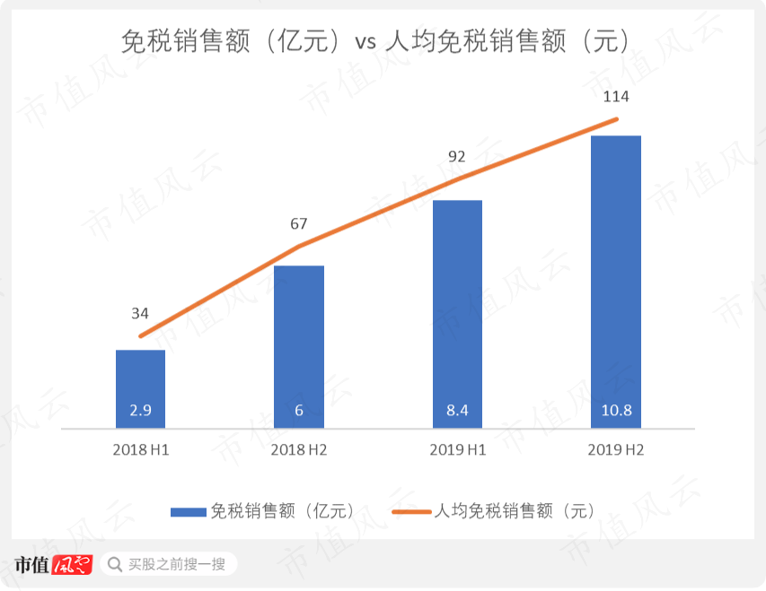 2018-2019年间白云机场免税销售额及人均免税销售额的逐步增长。从2018年上半年的人均免税销售额34元,到2019年下半年达到114元,整体呈现出稳步上升趋势。
