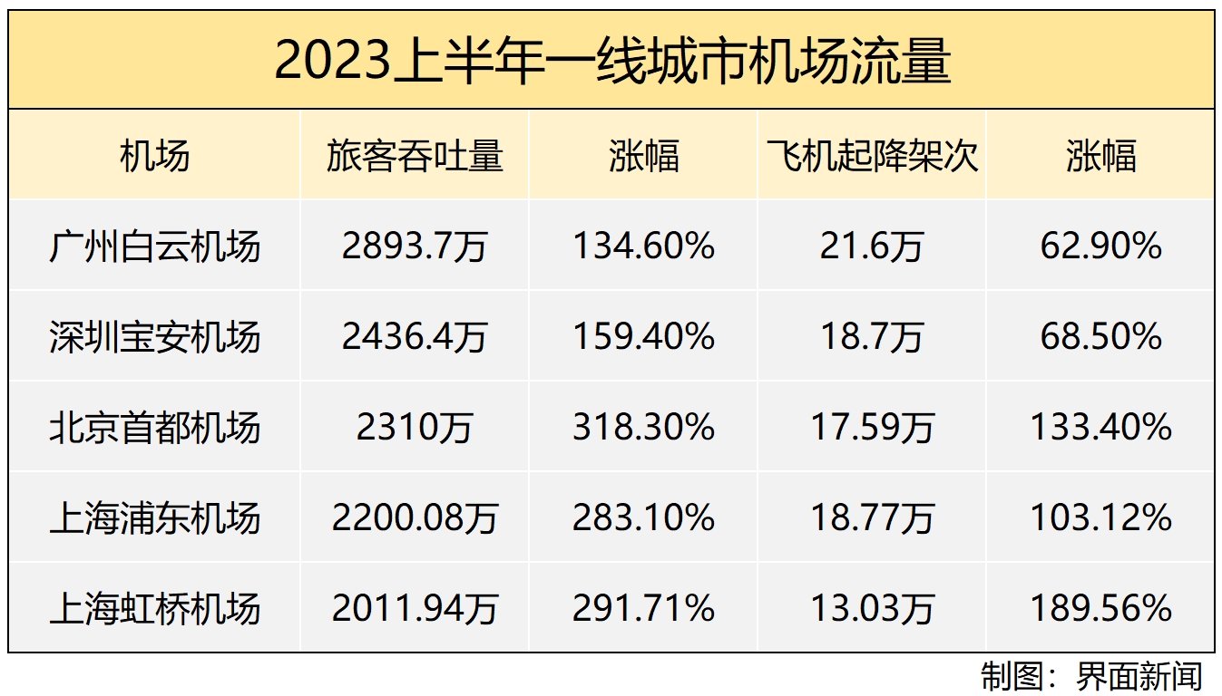 从四家机场披露的生产运行数据来看,上半年,首都机场飞机起降架次达17.59万架次,较去年同期增长约133.4%,旅客吞吐量超2310万人次,同比涨幅高达318.3%。