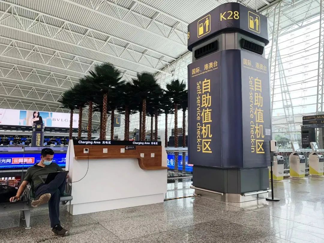 为提升旅客出行体验,满足候机旅客多样化的充电需求,白云机场在两座航站楼均配备了充足的充电设施。其中一号航站楼内有充电点位66个,按摩座椅1377张均自带免费充电口,另有30处充电宝点位,配备有不同品牌充电宝,方便广大旅客按需选用。