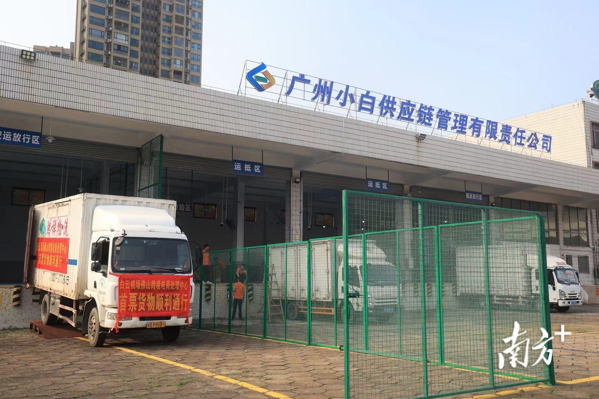 首车运载着93件出口跨境电商货品的货车从白云机场佛山跨境电商处理中心驶出。南方+李周秦拍摄