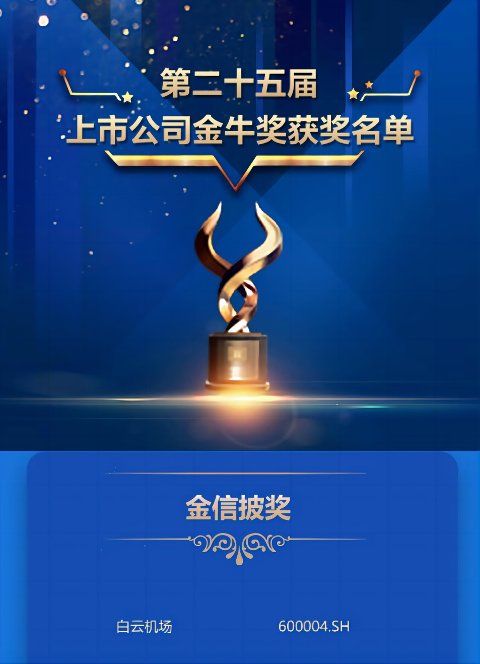11月23日,由中国证券报主办的2023上市公司高质量发展论坛暨第25届上市公司金牛奖颁奖典礼隆重举行,白云机场斩获2022年度金牛金信披奖。