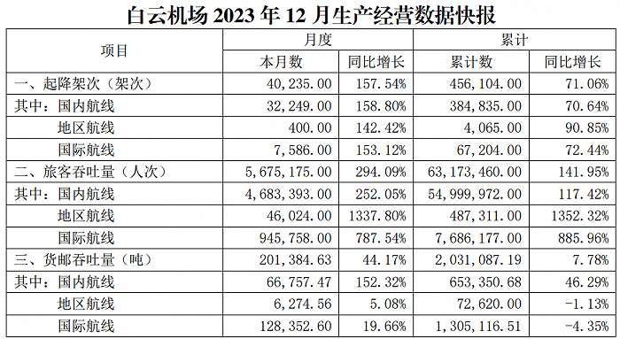 白云机场1月5日公告,2023年12月旅客吞吐量567.52万人次,同比增长294.09%;2023年累计旅客吞吐量6317.35万人次,同比增长141.95%。