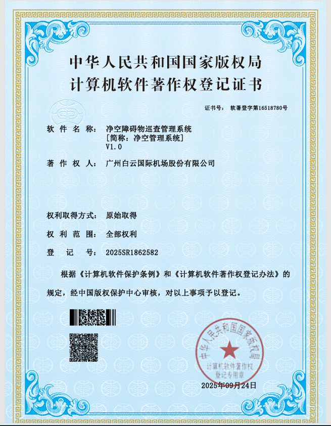 近日,公共区管理分公司与白云信息科技股份有限公司研发的“机场净空障碍物巡查管理系统”正式通过国家版权局审核,荣获《计算机软件著作权登记证书》。这一成果标志着白云机场在净空管理领域的数字化、智能化转型取得重要突破,为民航飞行安全构筑起一道坚实的科技屏障。
