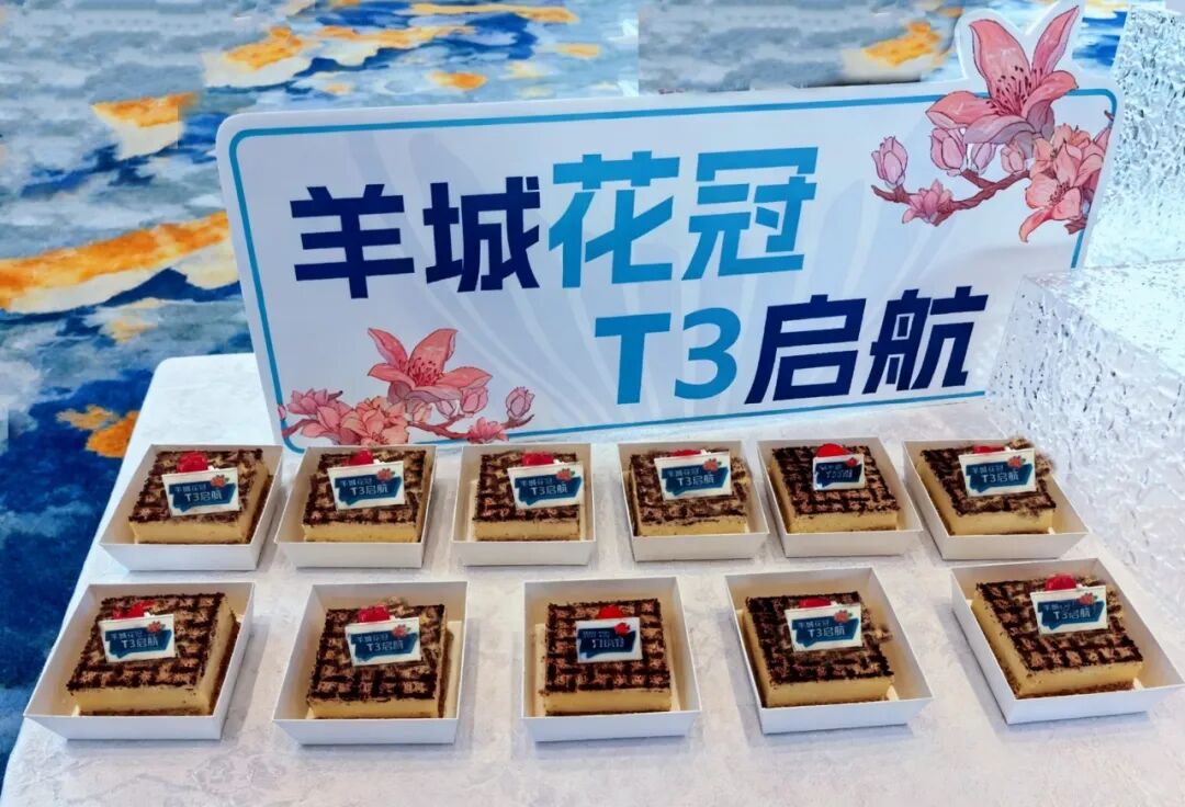 T3投运庆典的茶歇区,一份份精致点心悄然传递着启航的喜悦。首航现场,候机楼内的特色摊位更向活动嘉宾、媒体记者、首航旅客及工作人员等免费派送“羊城花冠,T3启航”主题蛋糕,让甜蜜从地面延伸至云端,藏进每一个人的味蕾记忆。