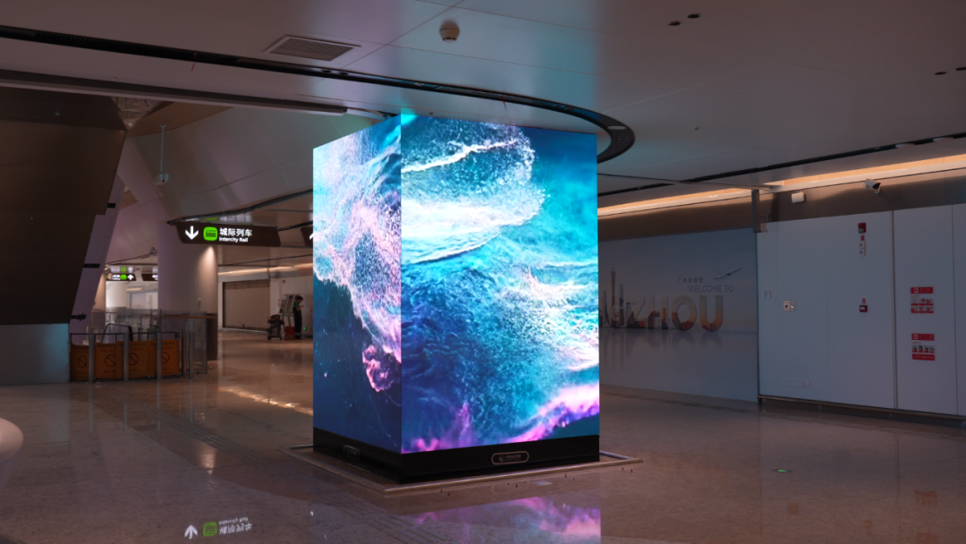 创意“包柱式”LED屏与虚拟数字内容融合,打造沉浸式视觉体验,旅客穿梭其中,仿佛置身数字艺术长廊。