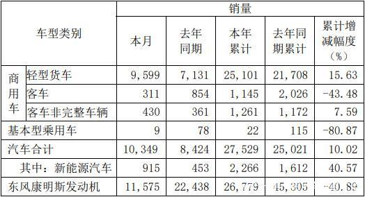1-2月份,东风汽车股份累计销售各类车型27529辆,同比增长10.02%。其中,轻型货车25101辆,同比增长15.63%;客车1145辆,同比下降43.48%;客车非完整车辆1261辆,同比增长7.59%。