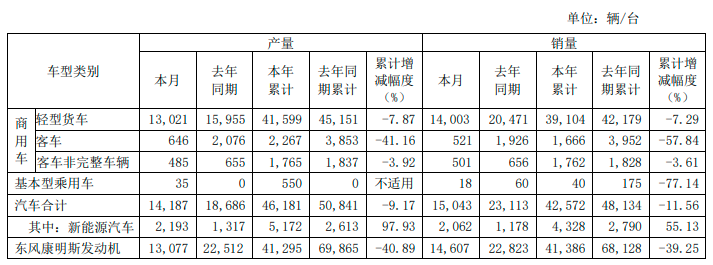 乐居财经讯刘治颖 4月6日,东风汽车(SH600006)公告,公司3月汽车产量约1.42万辆,1-3月累计产量约4.62万辆,累计产量较去年同比减少9.17%;3月汽车销量约1.5万辆,1-3月累计销量约4.26万辆,累计销量较去年同比减少11.56%。