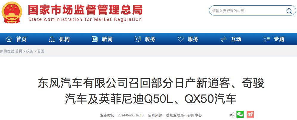4月3日,东风汽车有限公司根据《缺陷汽车产品召回管理条例》和《缺陷汽车产品召回管理条例实施办法》的要求,向国家市场监督管理总局备案了召回计划。自2024年4月4日起,召回以下车辆。