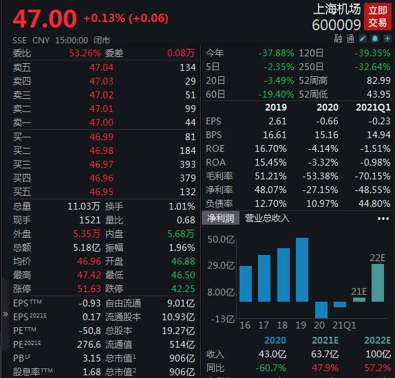 二级市场方面,上海机场7月7日收盘报47元/股,涨0.13%,年初至今跌37.88%,现总市值906亿元。