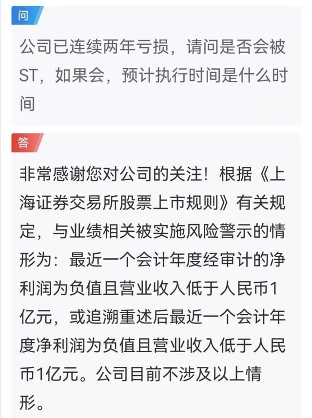 业绩连续两年为负,18.95万户股东是否感到忧虑呢?此前,有投资者在互动易平台上提问,“公司已连续两年亏损,请问是否会被ST,如果会,预计执行时间是什么时间?”