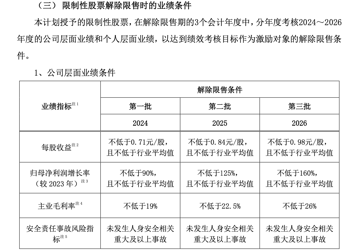 限制性股票解除限售时的业绩条件方面,公司层面,2024年至2026年每股收益不低于0.71元/股、不低于0.84元/股、不低于0.98元/股且不低于行业平均值。2024年至2026年归母净利润增长率(较2023年)分别不低于90%、不低于125%、不低于160%且不低于行业平均值。2024年至2026年主业毛利率分别不低于19%、不低于22.5%、不低于26%。此外,三年未发生人身安全相关重大及以上事故。