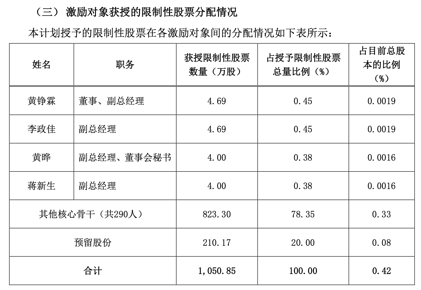 具体来看此次计划授予的限制性股票在各激励对象间的分配情况,包括四位副总经理以及其他290名核心骨干。
