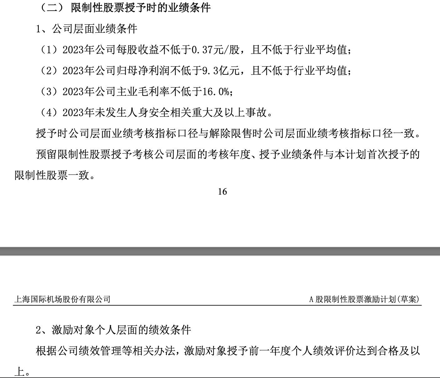 具体来看,限制性股票授予时的业绩条件方面,公司层面上,2023年公司每股收益不低于0.37元/股,且不低于行业平均值;归母净利润不低于9.3亿元,且不低于行业平均值;公司主业毛利率不低于16.0%;此外,未发生人身安全相关重大及以上事故。激励对象个人层面的绩效条件方面,根据公司绩效管理等相关办法,激励对象授予前一年度个人绩效评价达到合格及以上。