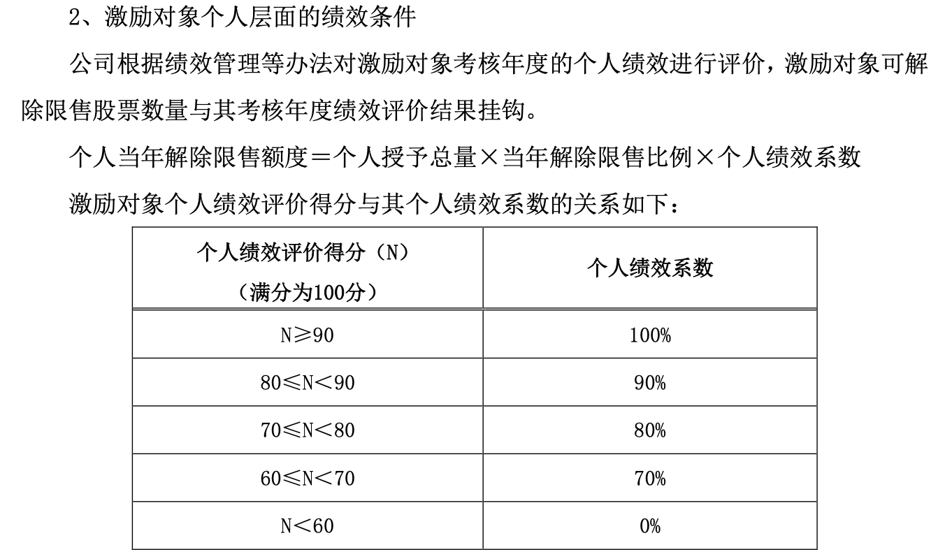 激励对象个人层面的绩效条件方面,公司根据绩效管理等办法对激励对象考核年度的个人绩效进行评价,激励对象可解除限售股票数量与其考核年度绩效评价结果挂钩。个人当年解除限售额度=个人授予总量×当年解除限售比例×个人绩效系数。