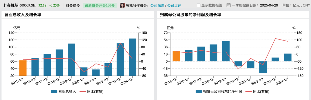 4月28日晚间,上海国际机场股份有限公司(上海机场,600009.SH)发布2024年年报和2025年一季度报告。去年实现营收123.69亿元,同比增长11.97%;归母净利润19.34亿元,同比增长107.05%。今年一季度实现营收31.72亿元,同比增长4.72%;归母净利润5.19亿元,同比增长34.53%。